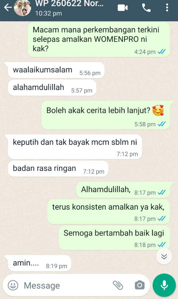 Alhamdulillah, majoriti pengguna yang dah amalkan WOMEN PRO ni memang berkesan jika betul-betul konsisten makan setiap hari. Untuk nampak kesan lebih cepat, biasanya peringkat awal akak akan rasa tubuh jadi ringan, tak sakit urat saraf, tumit akan kurang sakit, kencing akan lawas, kurang sakit pinggang dan lain-lain lagi.