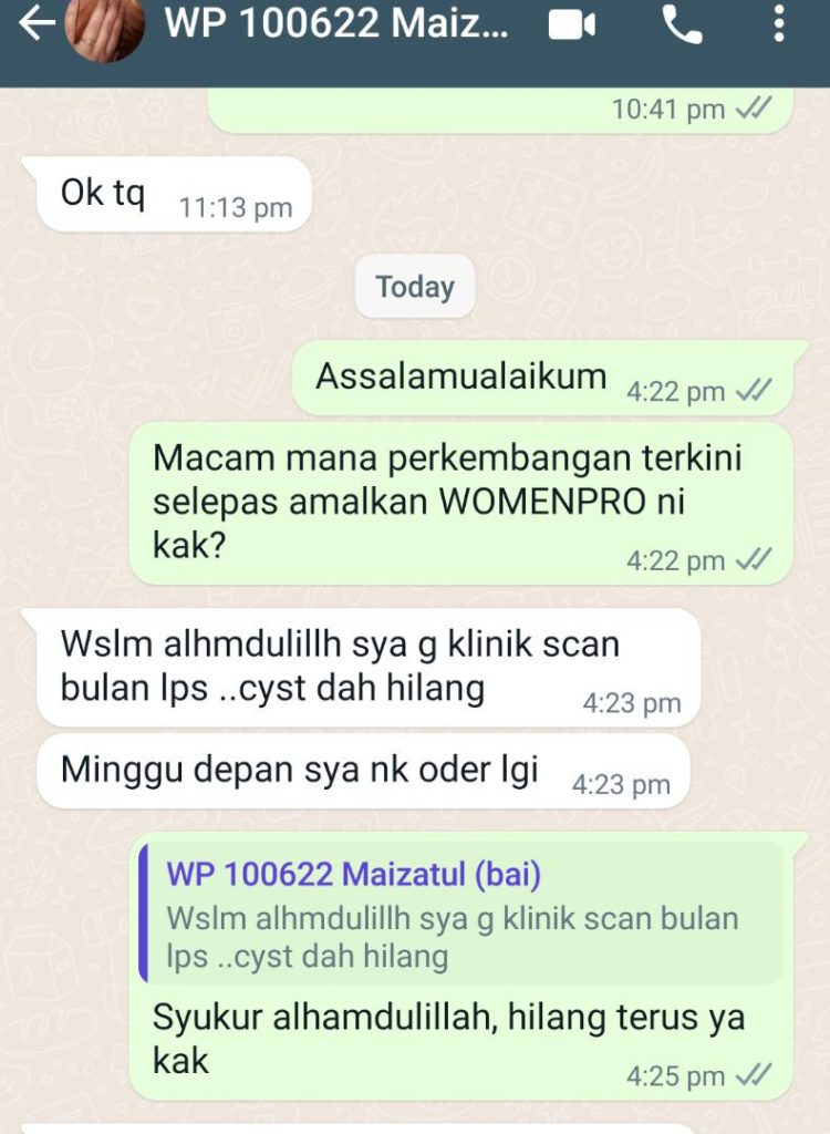 Saya syorkan sangat-sangat kat akak, akak wajib makan women pro ni, jangan biarkan lama-lama. effect dia sangat teruk kak, akan effect kepada tubuh kita dan boleh effect kepada suami sebab susah nak bersama. Silap hari bulan, akak ada madu.